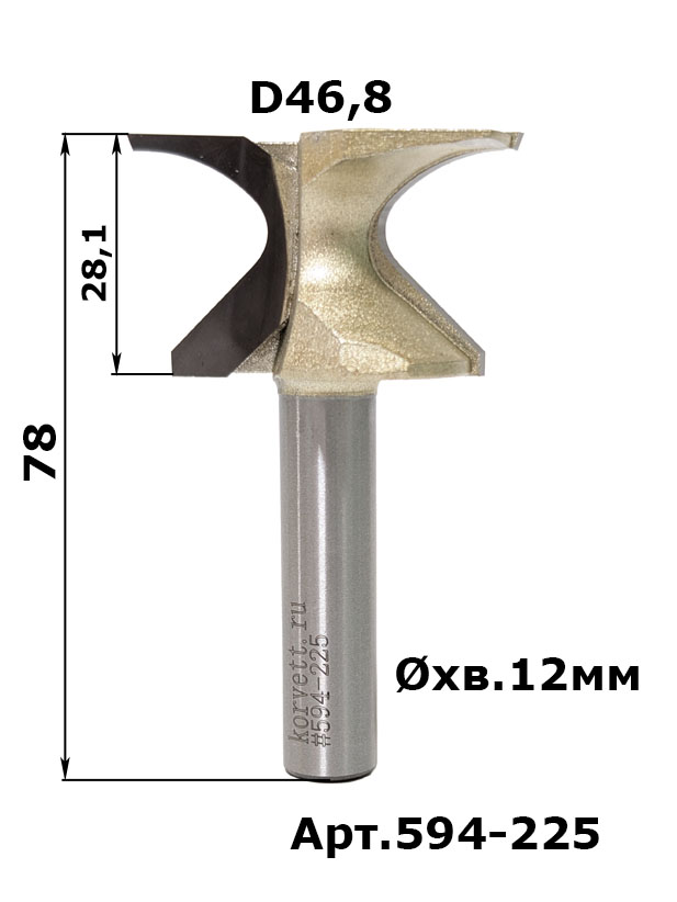 594-225 Фреза профильная "для столешницы" D38,2 H27 R18 TL77 Х12 Тип: Фреза для столешниц (калевка) Назначение: Формирование закругленного края на столешницах, подоконниках. Характеристики: Рабочий диаметр (D38,2): 38,2 мм Высота профиля (H27): 27 мм Радиус скругления (R18): 18 мм Габарит (TL77): 77 мм Хвостовик (Х12): 12 мм Особенности: Требует мощного фрезера.